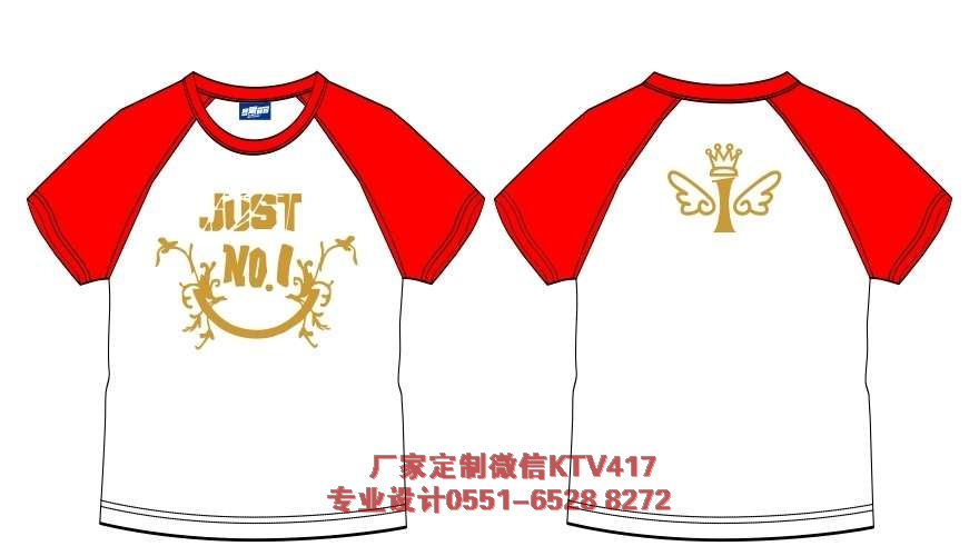 1班服裝圖片,此款班服采用的是紅色插肩袖T恤衫,這款顏色的衣服,班級采用的很多。款式比較經(jīng)典。前面印JUST NO.1,背面是1加皇冠,翅膀。
