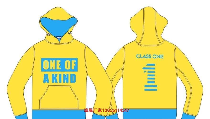 一班班服好看的,采用的是黃色套頭衛(wèi)衣,前后印刷CLASS ONE