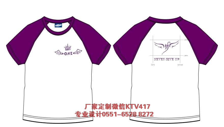 1班班級文化衫圖案,選個用的是紫色圓領T恤衫,前面是0NE 上面是皇冠,左右是翅膀,代表著1班奪冠,持續(xù)飛翔。后面是夢翅膀。很有進取元素。