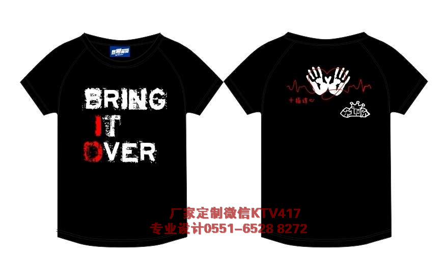 1班班徽設計,黑衣服印刷白色LOGO,和紅色的圖案,前面是BRING IT OVER 后面是愛心手掌。