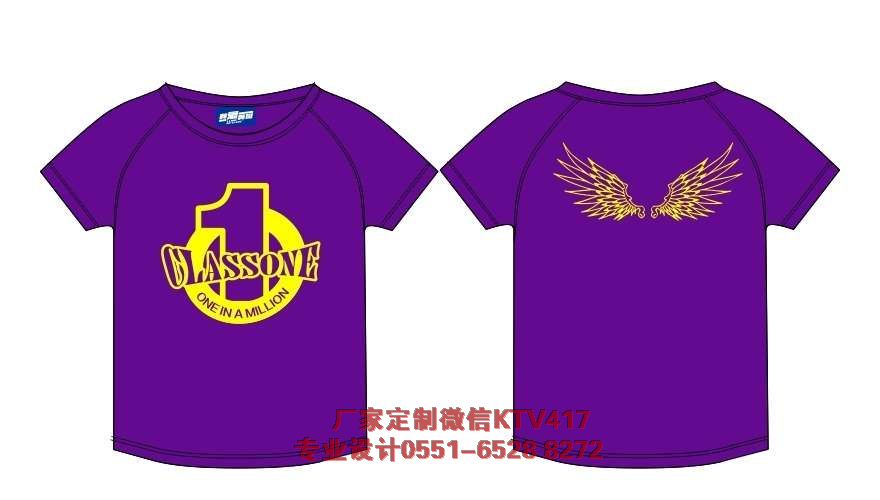 采用的是紫色的圓領文化衫,前面印 CLASS one,大號的數字1,充當圖案,后面是黃色的翅膀,寓意一班騰飛。紫色的衣服配上黃色的圖案很喜慶。視覺效果不錯!