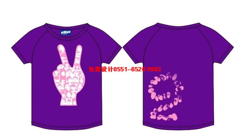 這款2班班服采用的深紫色的圓領T恤,前面印手指2手勢,后面的圖案為每個人的指紋組成的數字2.很有個性。