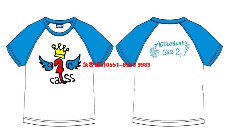 這款班服采用的是藍色插肩袖T恤,正面印皇冠,皇冠在上,翅膀在左右,中間是2.后面圖案是ACCOUNTANT,S