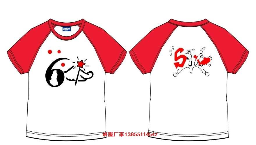 6班版衫圖案,這款6班版衫圖案采用的是紅黑相間的圖案,左邊是黑色的數(shù)字6,右邊是紅色的小星星。版衫后背圖案是字母SIX加愛心圖案。班服底衫采用的是紅色插間袖文化衫。