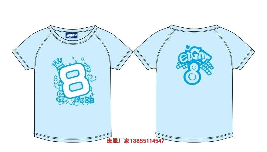 8班班服圖案,8班版衫LOGO該款8班班服采用的是淺藍色的圓領T恤,前面印刷大的數字8為主要圖案,后面是小的數字8為圖案,圖案顏色為深藍色。