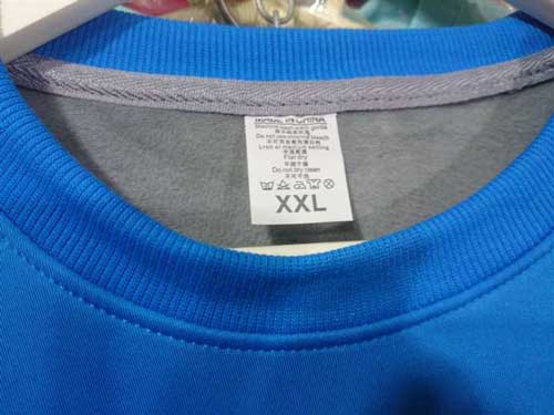我廠圓領(lǐng)藍(lán)色衛(wèi)衣領(lǐng)口,加絨加厚面料領(lǐng)口特寫(xiě):
