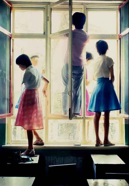 80年代的中學校園,有日光下踩著窗沿擦玻璃的女學生,在操場上或沉靜閱讀或俯身討論的同學,而更多的是一些局部和細節(jié):陽光曬得棕黃的腿,穿著涼鞋的腳,黑底碎花的泳衣輕貼的后背,還有深藍無袖外衫內(nèi)搭雪白襯衣的校服領口。