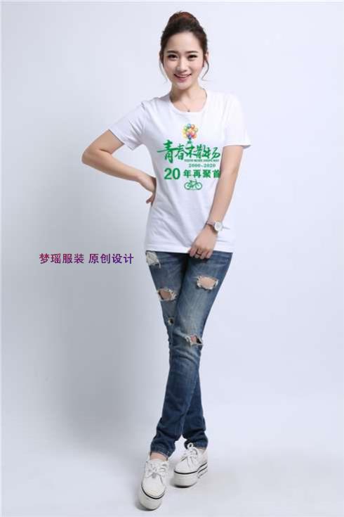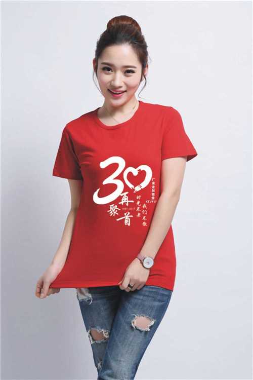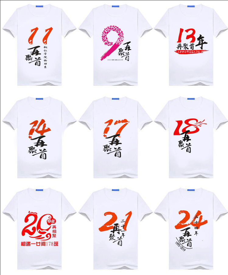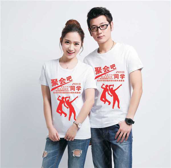 圓領素色做的衣服同學們做的最多,簡單大方,簡潔端正。一般都是白色的衣服,紅色衣服,白色的衣服同學們穿著顯白,年齡大的穿著也顯年輕,印字明顯。紅色對國人來說,是喜慶的顏色,可活躍現場聚會氣氛,紅紅火火,俗稱中國紅。紅衣服印刷黃色的圖案,很喜慶。聚會本身就是一件喜慶的事。