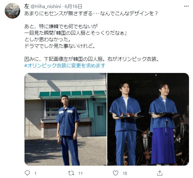 日本網(wǎng)友說(shuō):左邊的是韓國(guó)囚服,右邊雙人的是2021日本奧運(yùn)會(huì)服裝.出奇的像!