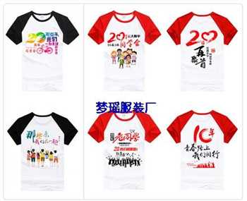 同學聚會t恤衫印字可以分為數字型,文字型,圖案型,文字數字組合型。聚會t恤衫印字內容可以任意組合。具體是文字型還是數字型,由同學們討論得出。聚會t恤衫印字可以根據款式,有針對性的設計。翻領T恤,圓領T恤衫,短袖T恤衫,長袖T恤衫,T恤款式不同,印字內容設計不同。